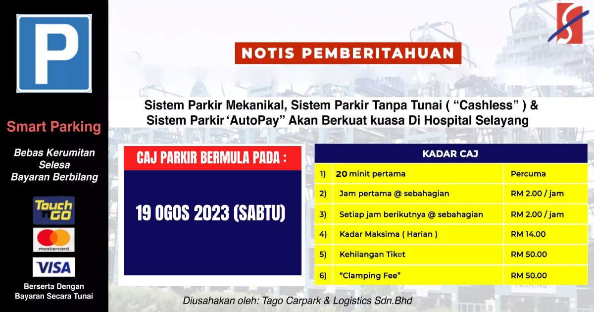 Adalah dimaklumkan bahawa Caj Bayaran Tempat Letak Kenderaan di Hospital Selayang akan mula beroperasi sepenuhnya pada 19 Ogos 2023 (Sabtu).