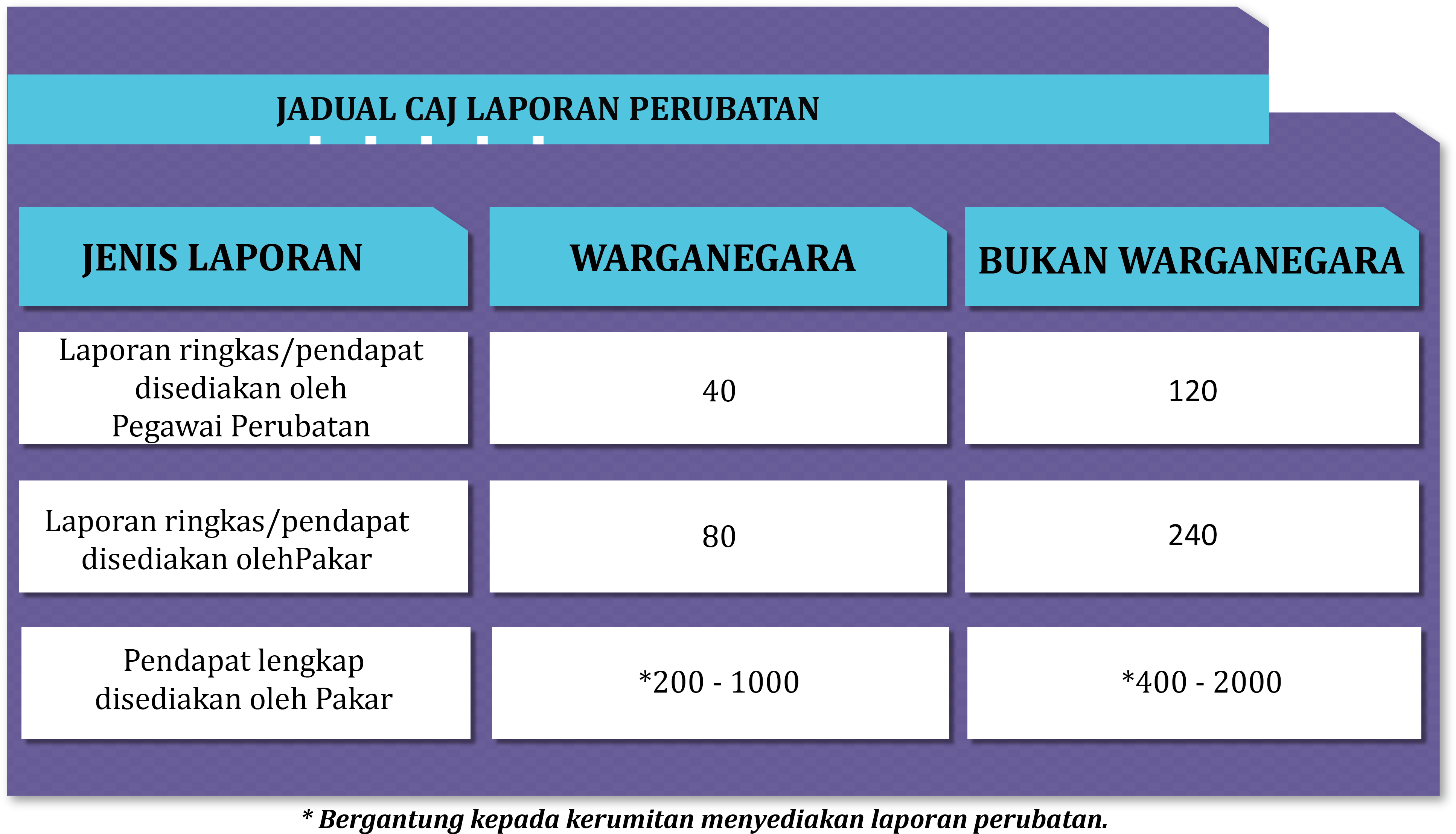 - Bayaran yang dikenakan kepada pemohon untuk laporan perubatan adalah seperti yang ditetapkan dalam Perintah Fee (Perubatan) 1982 dan Perintah Fee (Perubatan) Pindaaan 2003 - Bagi warganegara asing