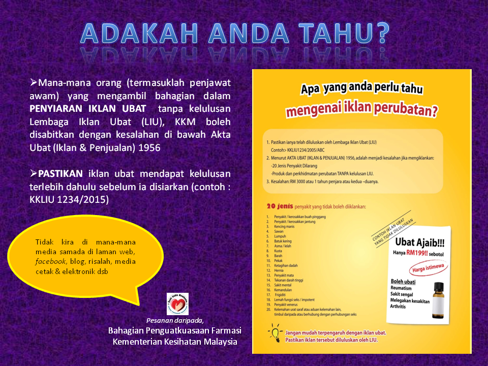 - Dimaklumkan bahawa Bahagian Penguatkuasaan Farmasi, KKM mendapati terdapat penglibatan penjawatawamKKM dalam penyiaran iklan ubat tanpa kelulusan Lembaga Iklan Ubat (LIU). Diingatkan bahawa Bahagian Penguatkuasaan Farmasi KKM sedang memantau penglibatan penjawat awam KKM yang terlibat dalam hal ini dan sesiapa yang mengambil bahagian dalam penyiaran iklan ubat tanpa kelulusan LIU, KKM boleh disabitkan dengan kesalahan di bawah Akta Ubat (Iklan & Penjualan) 1956.