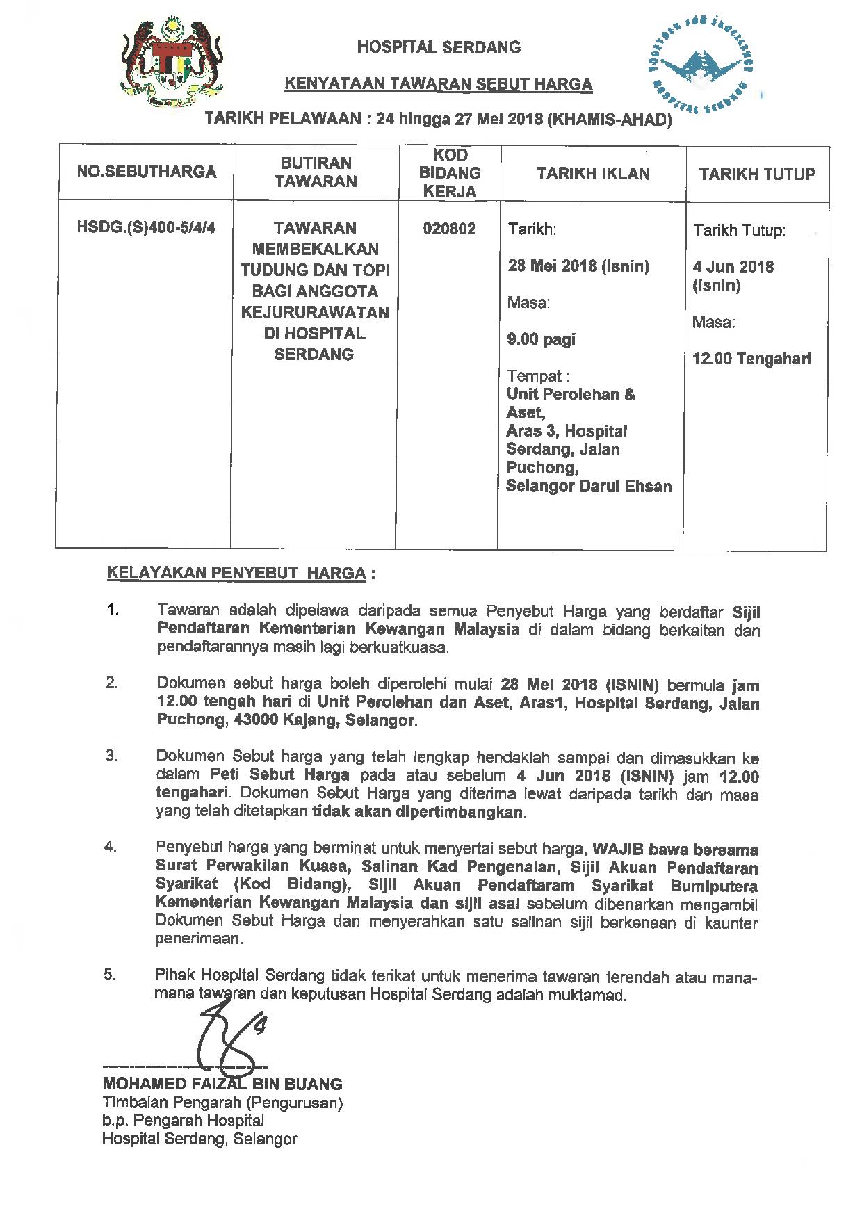 2. Untuk makluman,berikut dilampirkan pelanjutan tempoh paparan bagi Sebut Harga Membekalkan Tudung dan Topi bagi Anggota Kejururawatan di Hospital Serdang.