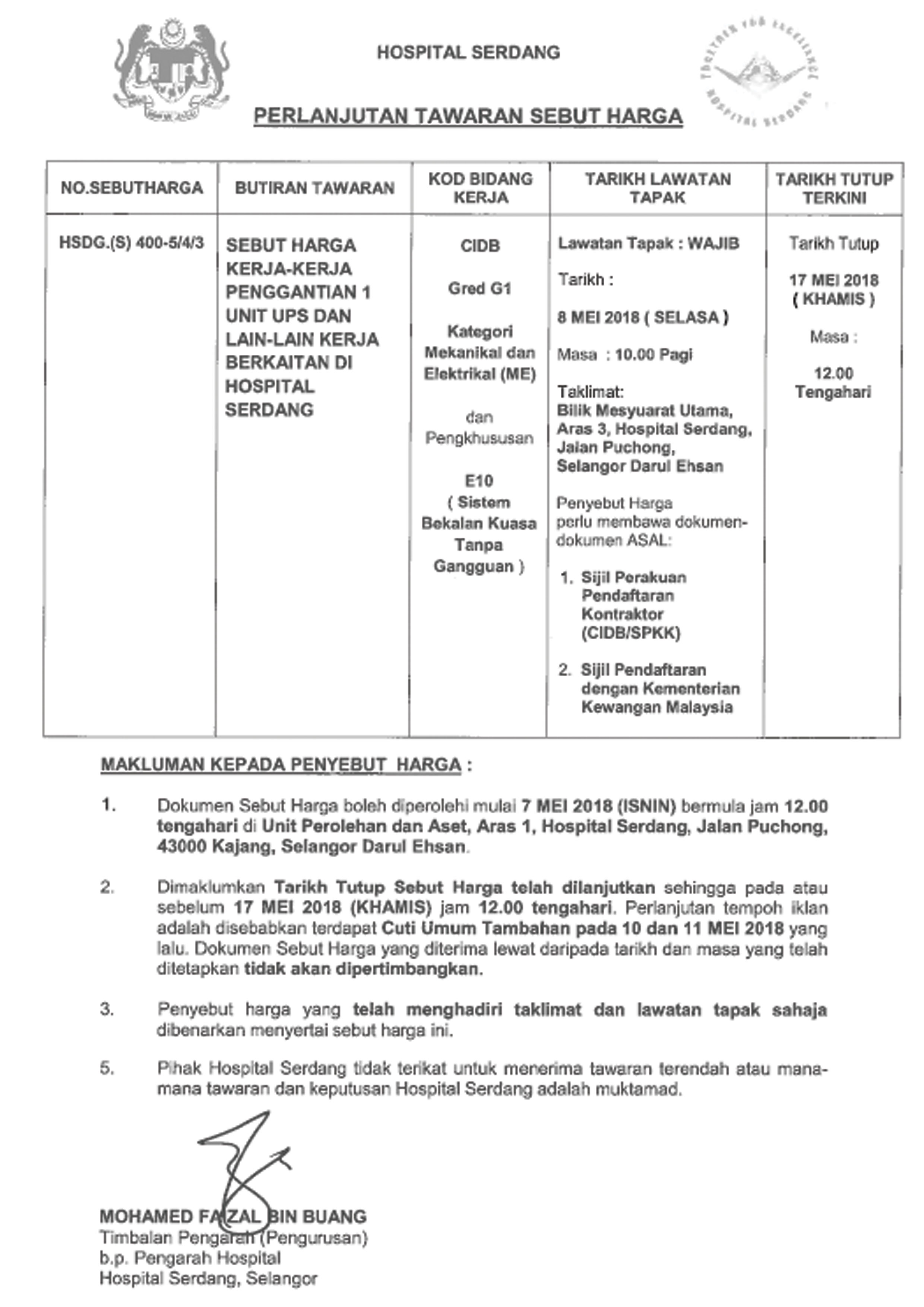 2. Untuk makluman,berikut dilampirkan pelanjutan tempoh paparan bagi Sebut Harga Kerja-kerja Penggantian UPS dan Kerja-kerja Berkaitan di Hospital Serdang.