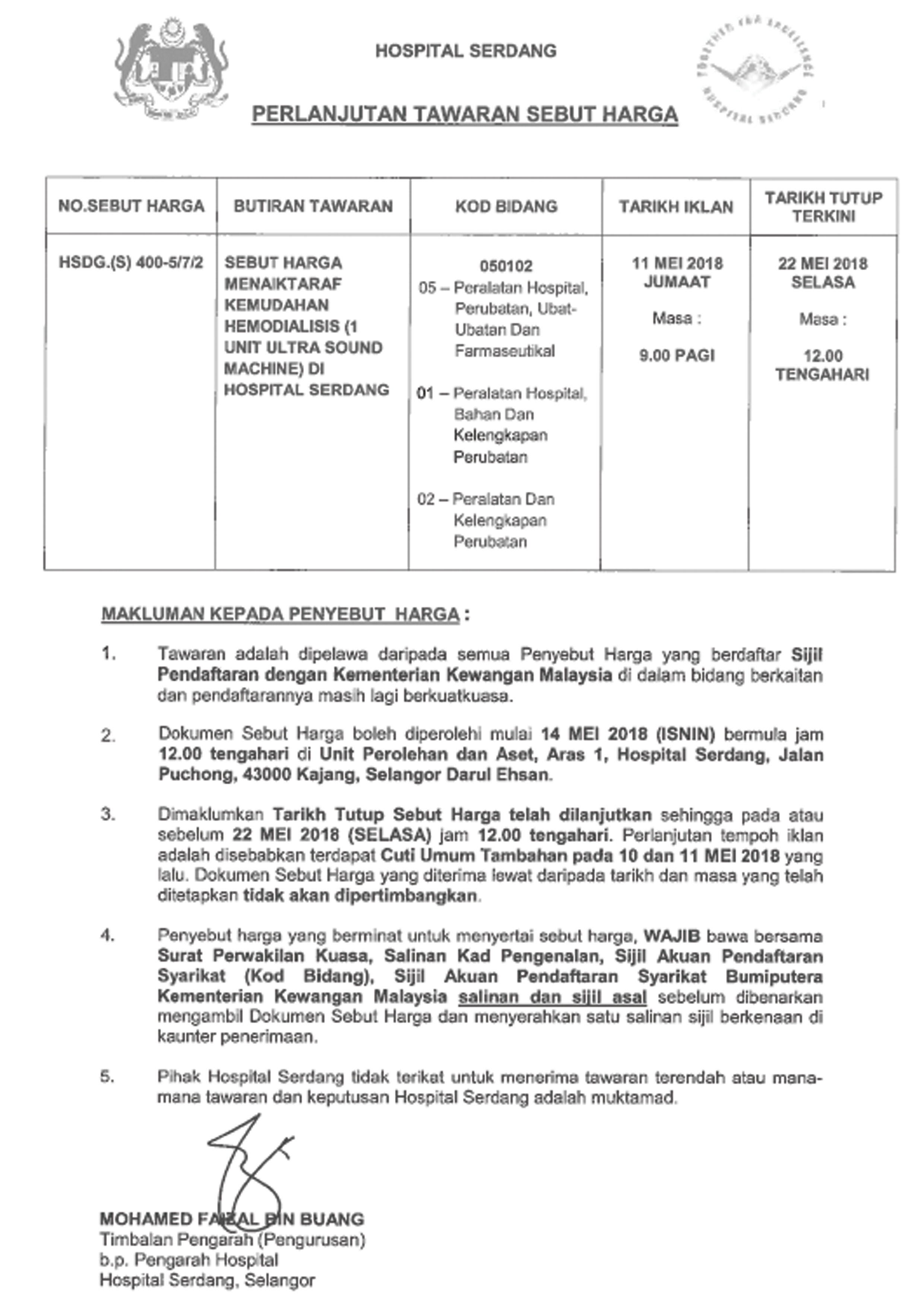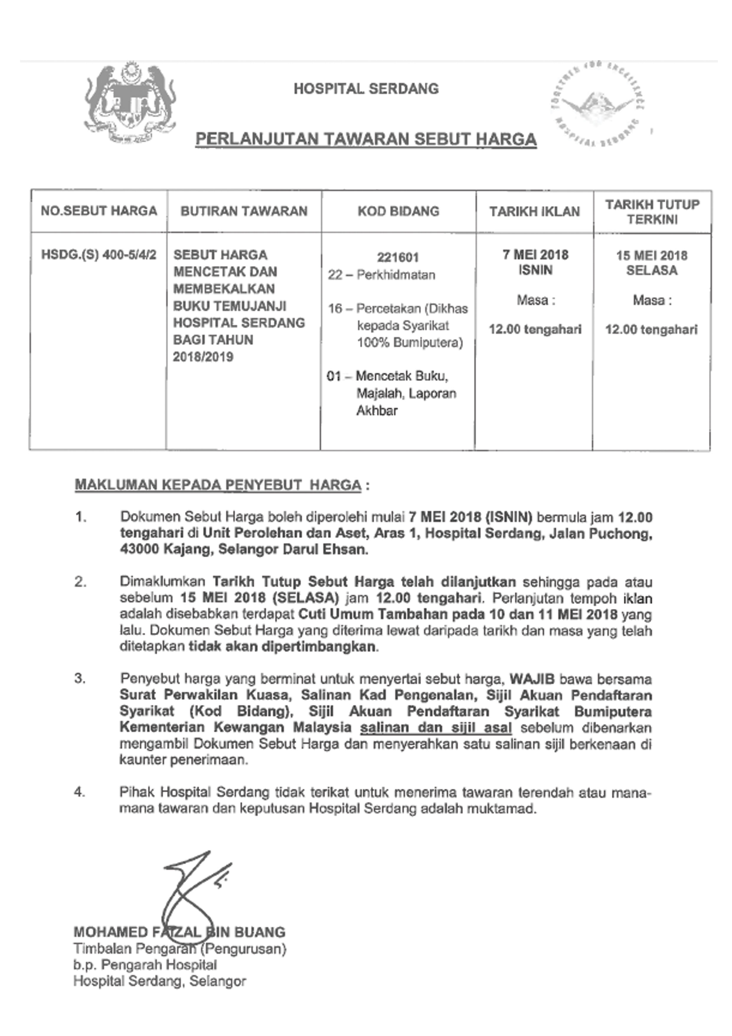 2. Untuk makluman,berikut dilampirkan pelanjutan tempoh paparan bagi Sebut Harga Mencetak dan Membekalkan Buku Temujanji Hospital Serdang.