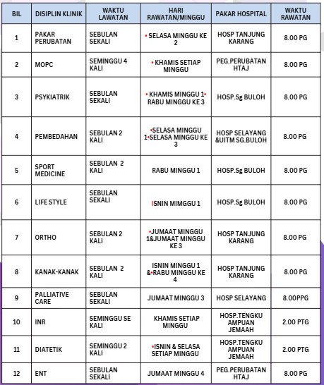 Menyediakan rawatan pakar di Hospital Tengku Ampuan Jemaah, Sabak Bernam untuk memberikan kemudahan kepada penduduk dan pesakit khasnya yang tinggal di kawasan sekitarnya.
